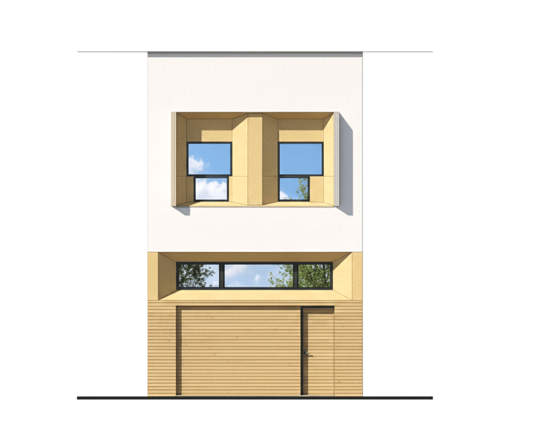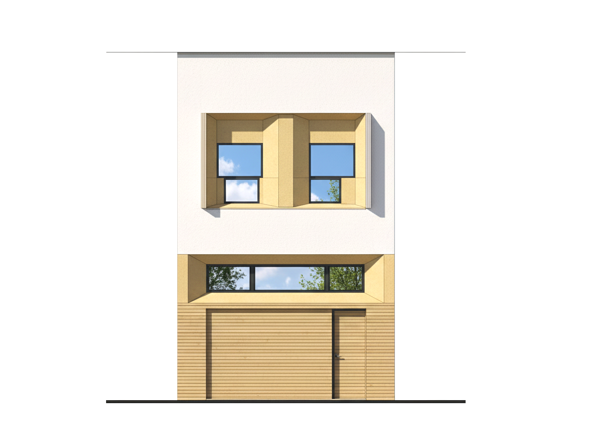 El diseño de la fachada consiste en que la planta de garaje se defina como un elemento sólido vinculado al suelo mediante un revestimiento de madera tecnológica, mientras que la planta alta se defina como un volumen blanco y ligero, con unos huecos tallados que pueden ocultarse gracias a una carpintería plegable que controla la luz y la privacidad, dejando el volumen superior totalmente blanco.