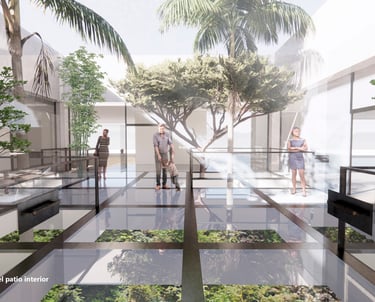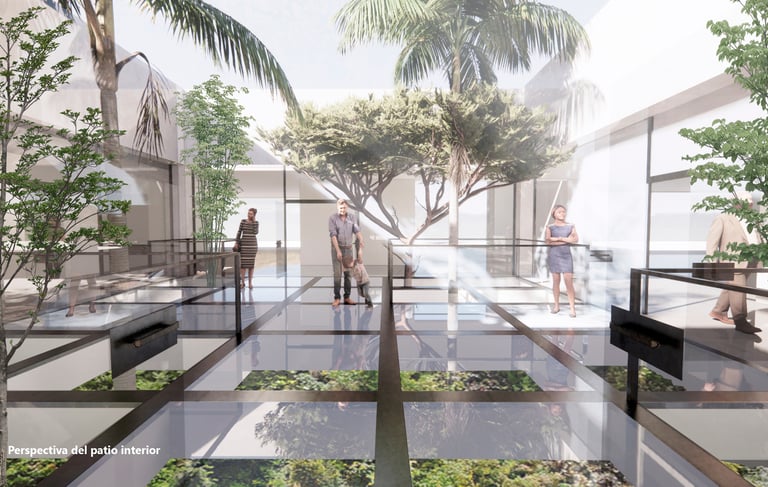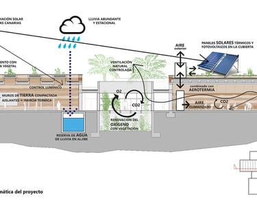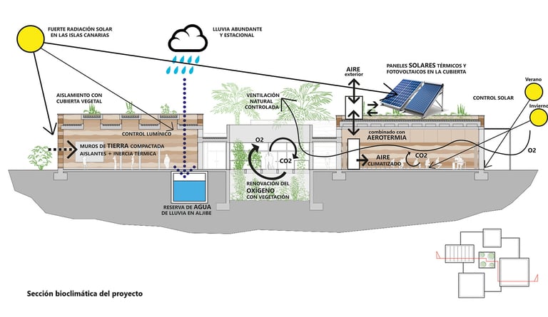Por su parte, todo el edificio se articula en torno a un patio, un patio como reinterpretación contemporánea del patio canario. Este patio sirve con su doble función a todo el edificio, la de servir como un agradable lugar de socialización y como método de regulación de las condiciones ambientales de confort mediante la vegetación, regulando renovación del aire, temperatura, humedad y sombra.