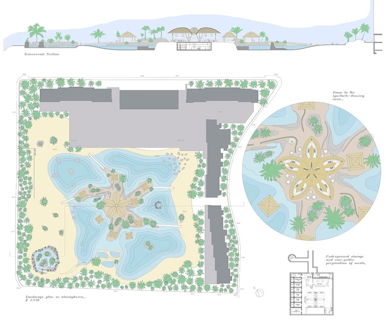 Propuesta de paisaje de tipo tropical y proponiendo los usos de piscina sectorizada con una isla central con pagoda en la que se ubica un restaurante con cocina-espectáculo. A su vez, se crean zonas para tomas el sol en torno a la piscina y un circuito de talasoterapia al aire libre.