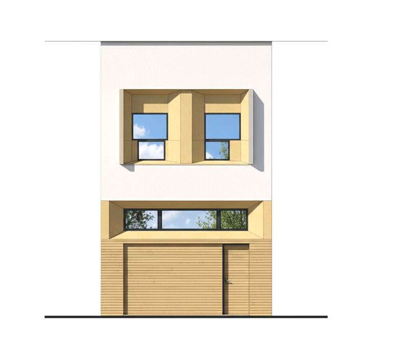 Mientras la planta de garaje se define como un elemento sólido vinculado al suelo mediante un revestimiento de madera tecnológica, la planta alta se define como un volumen blanco y ligero, con unos huecos tallados que pueden ocultarse gracias a una carpintería plegable que controla la luz y la privacidad, dejando el volumen superior totalmente blanco.